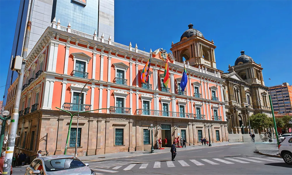 The Palacio Quemado is a prime example of Bolivian colonial architecture, with Neoclassical and Baroque influences that make it a visual testament to Bolivia’s historical past. Its warm-colored façade is adorned with columns, wooden details, and balconies, giving it an imposing and majestic air.