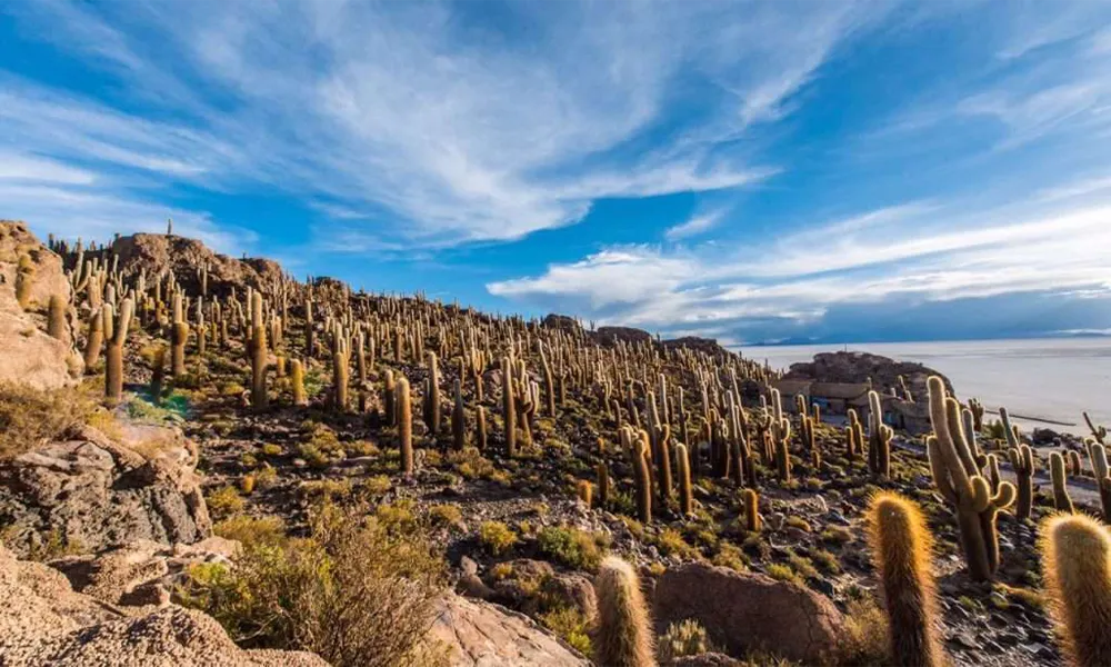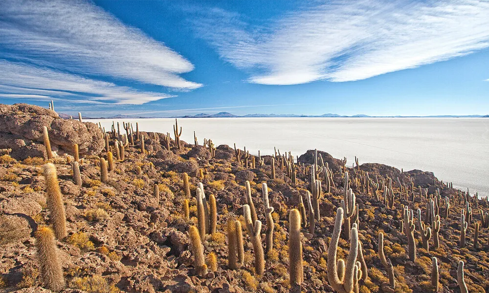 Incahuasi Island is one of the most iconic and photographed spots in the Salar de Uyuni, a place that seems otherworldly. Surrounded by an endless expanse of white salt, this rocky island covered in giant cacti breaks the monotony of the salt flats and offers one of the most breathtaking landscapes in Bolivia.