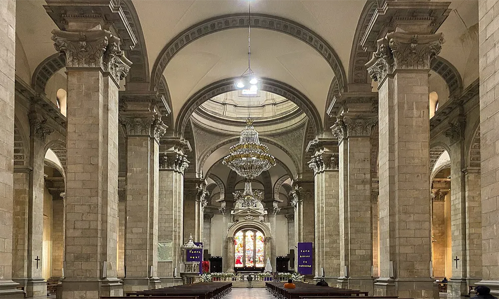 The interior houses a marble high altar brought from Italy, bronze inlays, and a collection of sacred art that reflects centuries of religious devotion.