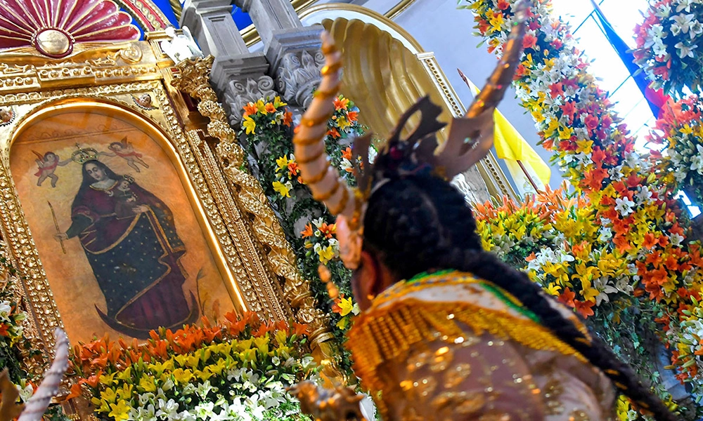 Inside is the venerated image of the Virgin, richly ornamented, surrounded by candles, offerings, dance costumes, and symbols that reflect fulfilled promises and expressions of gratitude.