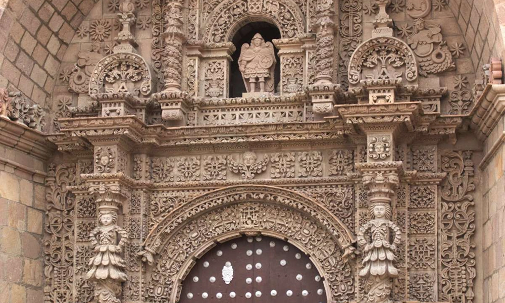 O portal de San Lorenzo de Carangas é considerado um dos mais complexos e refinados dos Andes. Esculpido inteiramente em pedra, funciona como um retábulo exterior que combina elementos europeus com símbolos andinos reinterpretados.